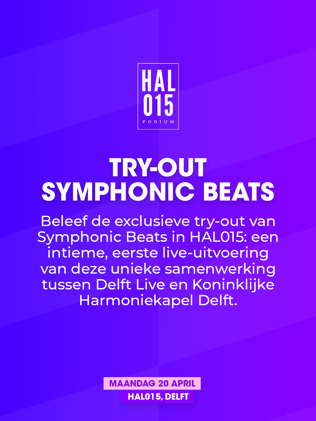 In de aanloop naar het grote event Delft Live op zaterdag 25 april kun je alvast op maandag 20 april genieten van de try-out van Symphonic Beats! In een kleinere setting in Hal015 wordt het sowieso genieten.